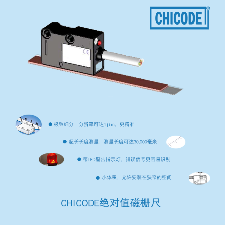 400 - 880 - 3995CHICODE絕對值磁柵尺是precilec雷恩磁柵尺產品的一個大類,主要應用于測量絕對線性位移的應用場景,即使失電期間的位置變更也不影響所顯示的測量值的精度,因為每一個點的絕對位置都已被記錄在編碼的磁柵尺上。如果在維護保養時,讀數頭需要臨時離開磁柵尺,復原后也不需要重新建立參考點操作。